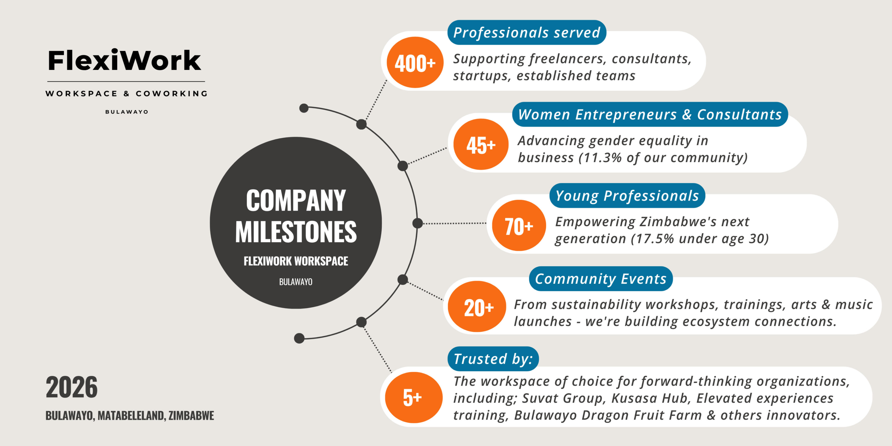 As Matabeleland's first professionally managed business coworking ecosystem, FlexiWork Workspace has proven the model works - serving 150+ professionals in Year One with 99%+ uptime.Now we're at a critical growth inflection point: strategic ESG partnerships enable us to sustain operations, scale infrastructure, and expand this proven model across Zimbabwe's underserved cities and regions.